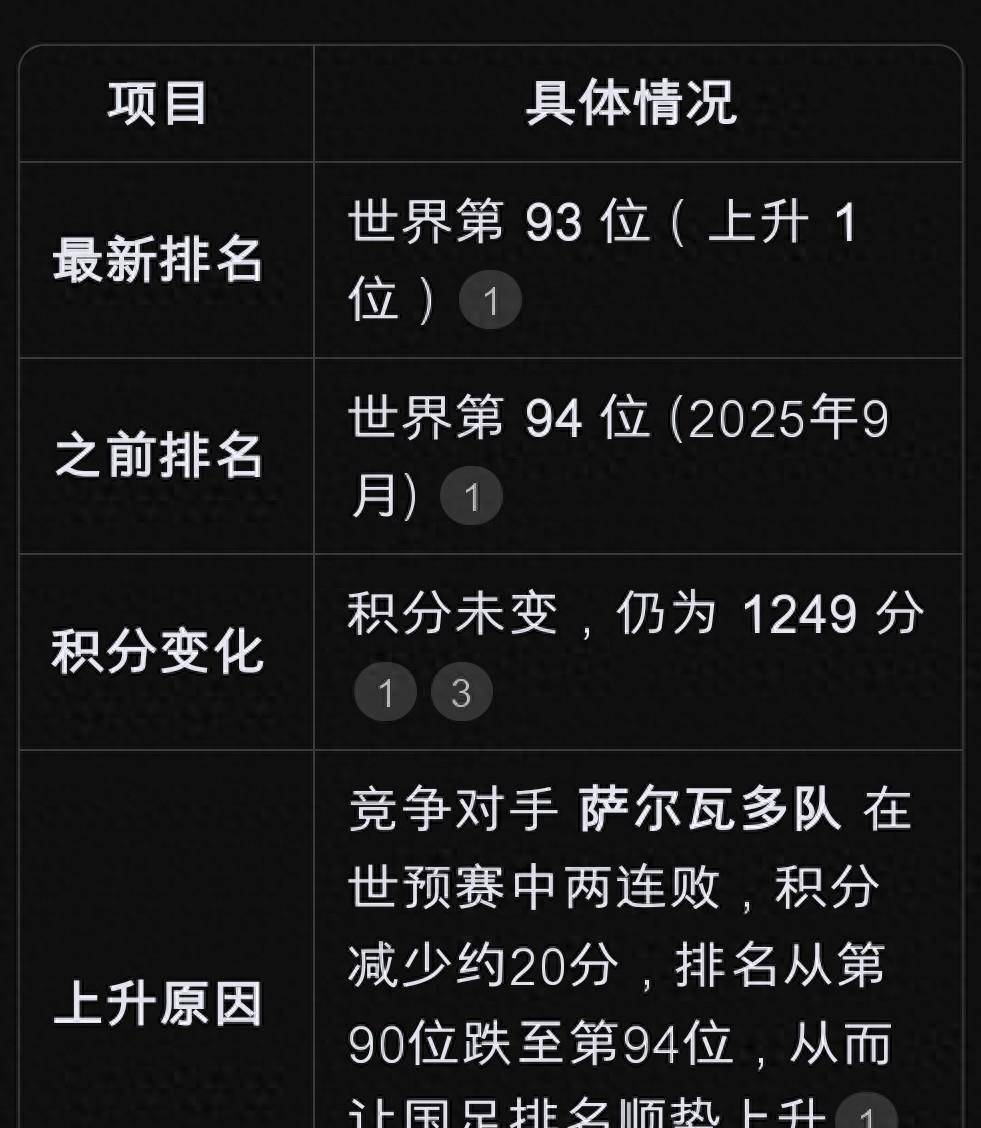 爱体育,爱体育官网,爱体育APP,爱体育APP下载,爱体育下载,爱体育网页版,爱体育电竞,爱体育百家乐,爱体育百家乐,爱体育真人,CBA,CBA赛程表,CBA直播,NBA,NBA直播,UFC格斗国际足协十月世界排名公布啦,中国男足“意外”前进到第93位。这次排名提升和中国队表现没关系,是其他球队下滑导致的。萨尔瓦多队连战连败,从第90名掉到第94名,中国队就跟着往前进了。中国队没训练也没比赛,排名变化就像“躺平胜利”的例子。这消息乍一听挺轻松幽默,可仔细反映出中国足球现状:进步不是靠自身实力,更多是靠其他国家失误。