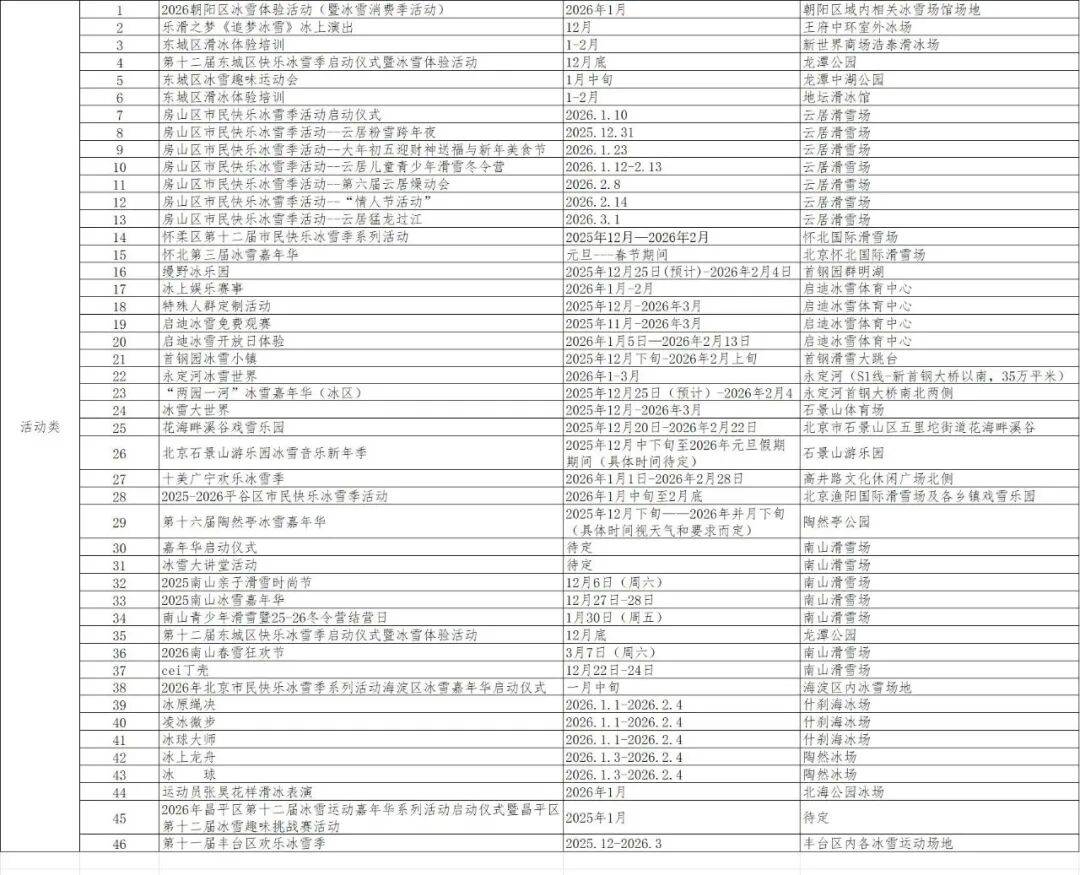 2025-2026北京冰雪消费季是贯彻落实《国务院办公厅关于以冰雪运动高质量发展激发冰雪经济活力的若干意见》及《以冰雪运动高质量发展激发冰雪经济活力的实施意见》的重要举措,旨在通过“四大发布推介”的系统化布局,为市民与游客构建“有赛事可看、有品牌可逛、有线路可玩、有服务可享”的冬季冰雪消费新图景,并依托全市联动及“跟着赛事去旅行”等文商体旅深度融合的创新模式,结合区域特色资源,推出形式多样、各具特色的冰雪赛事、趣味体验、旅游推广与文化展演活动,推动北京从“双奥之城”向“国际赛事名城”迈进,打造覆盖全域、贯穿雪季的冰雪消费盛宴。