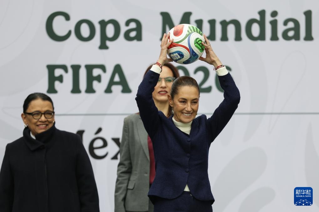 11月10日,墨西哥总统辛鲍姆在发布会上举起2026年国际足联世界杯比赛用球。