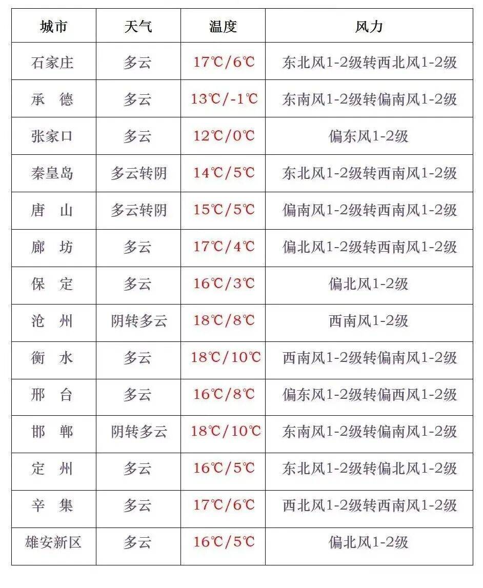 今天白天,唐山、秦皇岛和石家庄、沧州及以南地区多云间阴,其中沧州东部、衡水东部、邢台东部、邯郸南部有零星小雨或小雨,其他地区多云间晴。张家口、承德最高气温7℃至14℃,其他地区15℃至21℃。