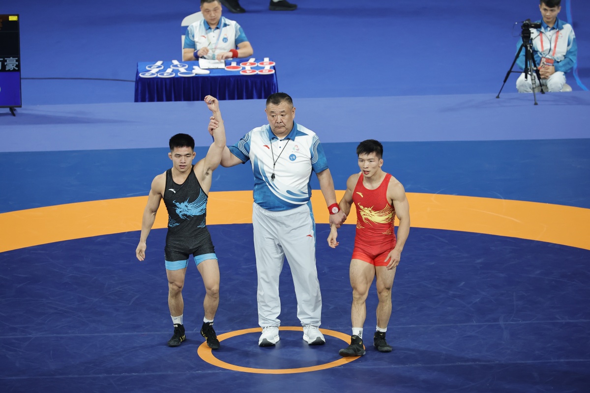 全运会男子自由式摔跤57公斤级比赛中,广西选手邹万豪、刘明瑚包揽金银牌。覃浏榴 摄