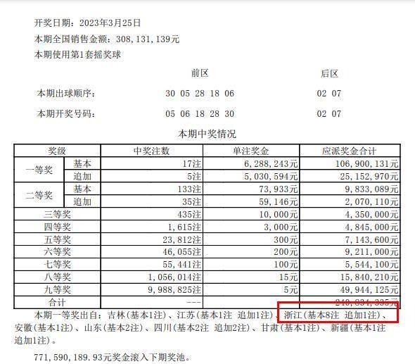 超级大乐透第23032期前区开奖号码:05、06、18、28、30、后区号码:02、07、龙头号码开出了05,凤尾号码开出了30,开出了一组2连号05、06和一组同尾号18、28,前区三区分布比为2:1:2,总体来说比较均衡,三区都有下号码,大小比为3:2、奇偶比为1:4、前区和值为87,与上一期比对下降了26个点。本期一等奖分别被:浙江彩民(基本8注,追加1注)、四川彩民(基本2注,追加2)、江苏彩民(基本1注,追加1注)、新疆彩民(基本1注,追加1注)、山东彩民(基本2注)、吉林彩民(基本1注)、安徽彩民(基本1注)、甘肃彩民(基本1注)、所中,共计17注。
