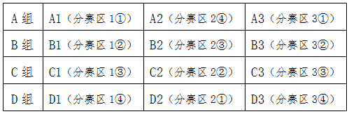 2)决赛:预赛各组别前四名晋级市级决赛,采用先分组单循环再交叉淘汰的赛制,落位顺序如下图(如遇同预赛区的队伍同组作适当调整)。