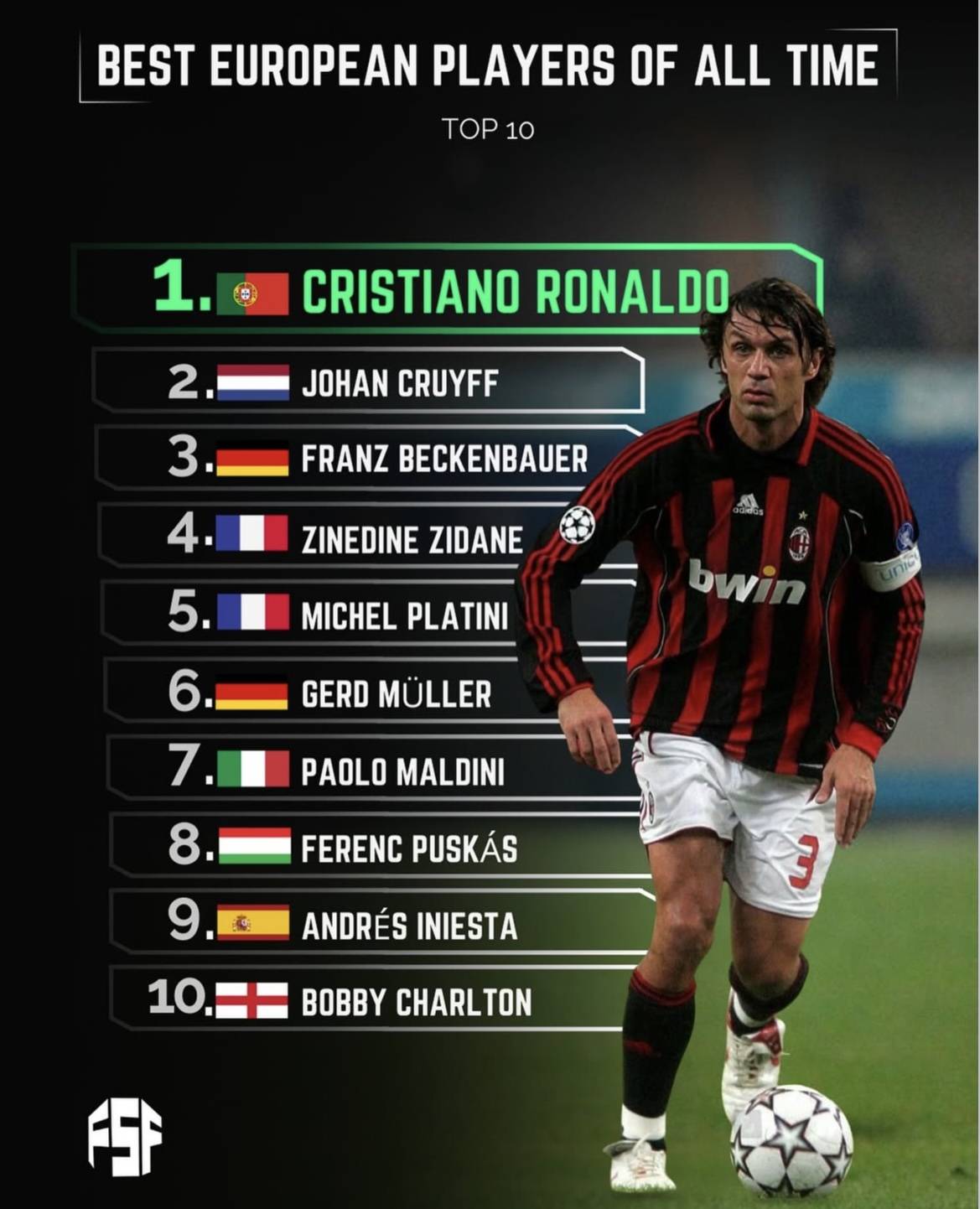 如果只看入选名单,这个榜单还算“八九不离十”,基本把欧洲传统公认的几大巨星都点到了:C罗、克鲁伊夫、贝肯鲍尔、齐达内、普拉蒂尼、普斯卡什、盖德·穆勒这些名字,怎么排顺序见仁见智,但出现在前十里不算离谱。争议主要有两块:一是位置分布太偏向前场和组织核心,门将一个都没有,中卫除了马尔蒂尼、贝肯鲍尔就没人了;二是伊涅斯塔排到第九,而像盖德·穆勒、普斯卡什这种“进球机器”被压在后面,有人肯定会觉得顺序偏感情多于数据。